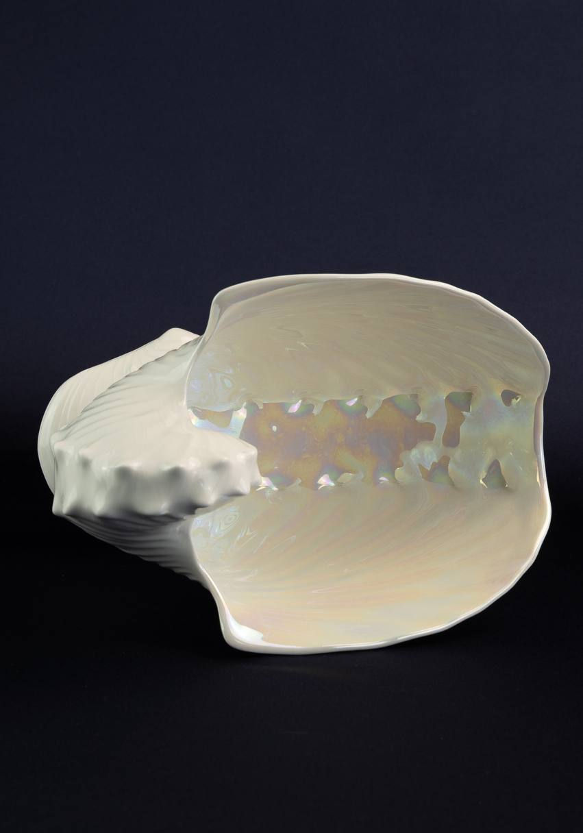The shape of the shell is executed with high sculptural precision: undulating edges, natural asymmetry and the soft pearlescent sheen of the inner surface create the effect of a ‘living’ object. Combined with the minimalist base, the piece is perceived as a fully-fledged interior sculpture.