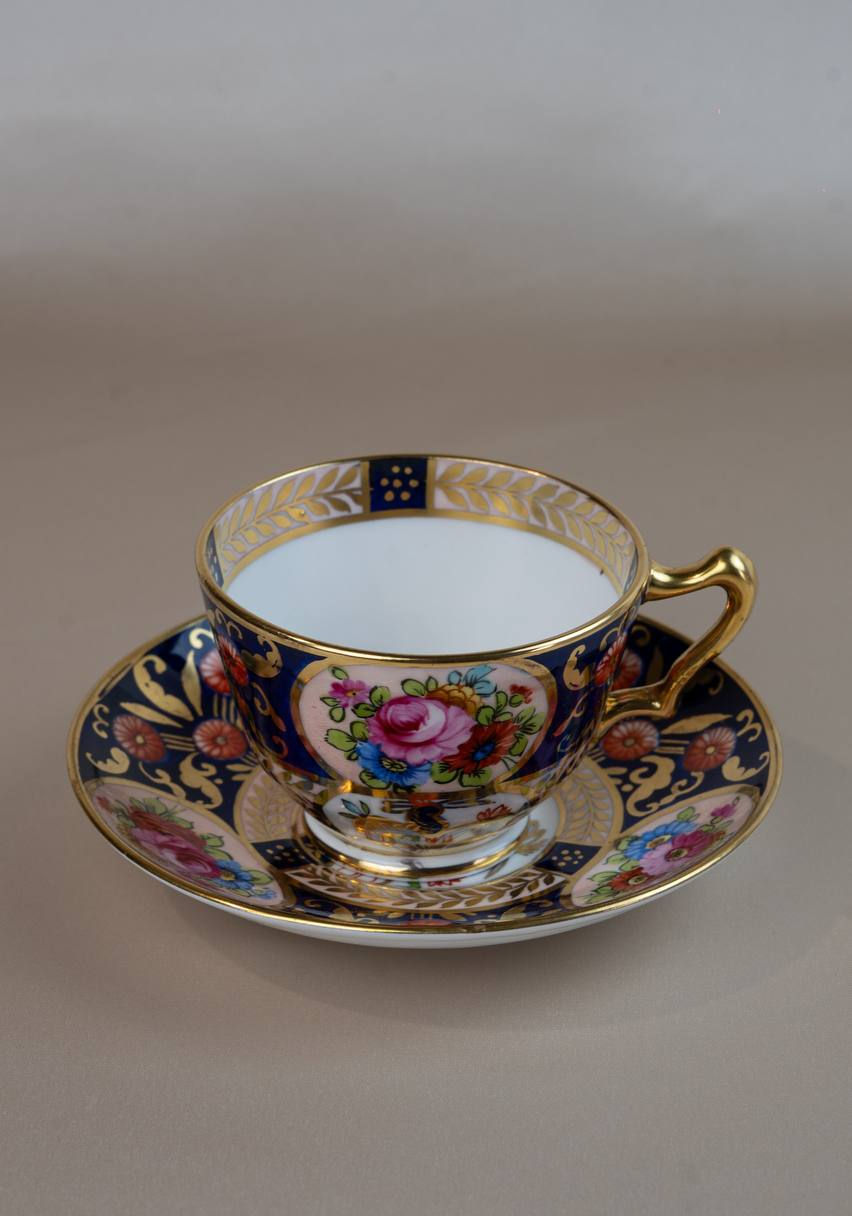 The deep cobalt background is generously decorated with gilded ornamentation (leaf borders, geometric inserts), medallions with floral bouquets and a central decorative motif — classic English aesthetics of the early 20th century, created for exquisite tea parties and display interiors.