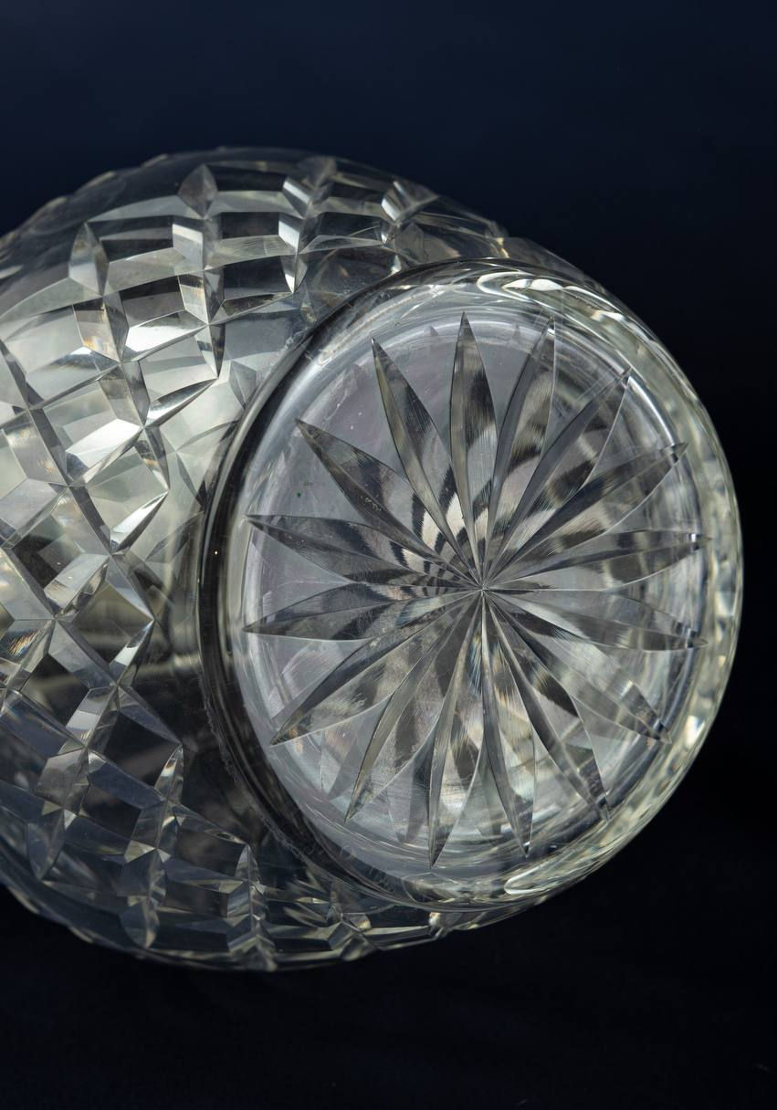 The bodies of the vessels are decorated with an intricate geometric cut pattern, creating a beautiful play of light and emphasising the crystal's transparency. The base is made in the form of a star with a radial cut — a characteristic detail of high-quality English production.